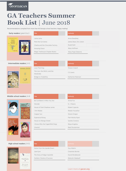 School’s out for summer—and reading lists are in! You’ll find plenty of suggestions in coming weeks, but GeorgiaCAN sourced ours from the folks who know best: elementary and middle school teachers across the state!