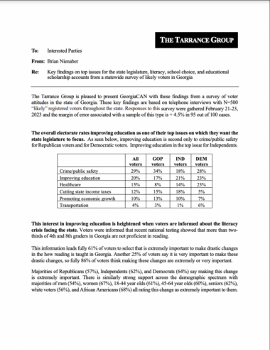Key findings on top issues for the state legislature, literacy, school choice, and educational scholarship accounts from a statewide survey of likely voters in Georgia